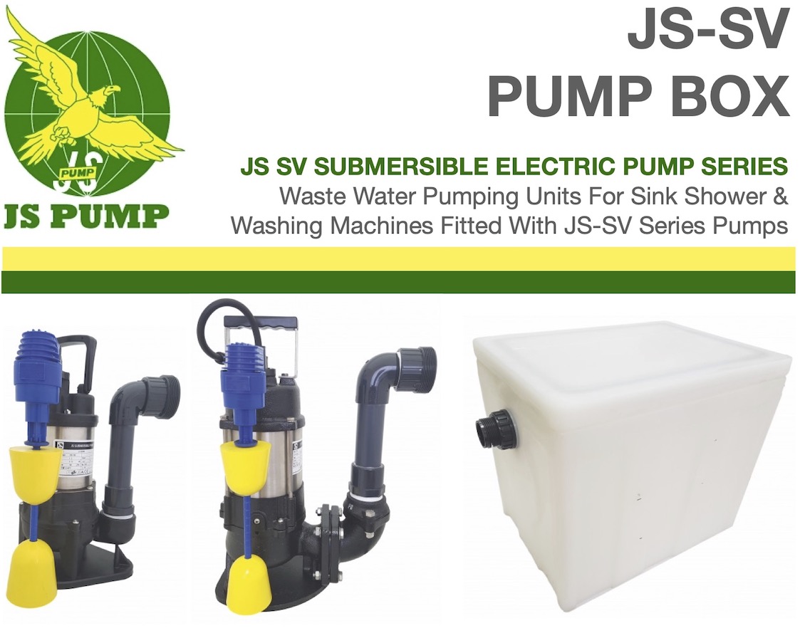 JS Pump Box Self Contained Waste Water Pumping Units. JS Box 150 has the JS Pump 150 SV pump fitted and the JS Box 250 has the  JS Pump 250 SV pump fitted. Both pumps are fitted with the Agma W Float Switch which can be adjusted for different level tun on and off's if required from the factory setting. All require assembly.