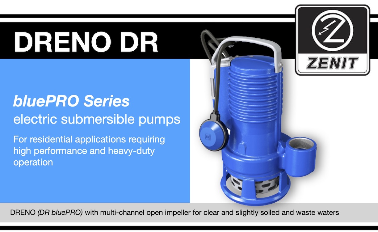 Designed for domestic and professional use, the Zenit Dreno DR Blue Pro range of submersible drainage pumps has an open, multi-channel impeller, for most soiled-water applications. Cellars and basements. Industrial schemes. Final effluent. Nuisance water. Hire fleets. Civil construction.